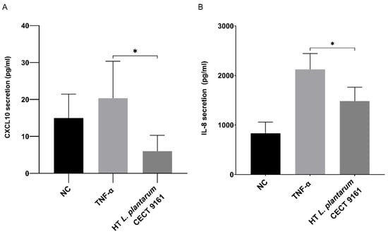 Cells derived from human buccal mucosa were incubated with TNF-α and HT L. plantarum CECT 9161 to investigate the effect of the postbiotic on the production of pro-inflammatory cytokines. This assay revealed the suppression of pro-inflammatory cytokine production by the postbiotic. HT L. plantarum CECT 9161 significantly inhibited the secretion of IL-8 (29 ± 3% of control; p = 0.0362) and CXCL10 (72 ± 6% of control; p = 0.0107) compared with the TNF-α positive control (Figure 3). No cytotoxicity was observed (p = 0.36).