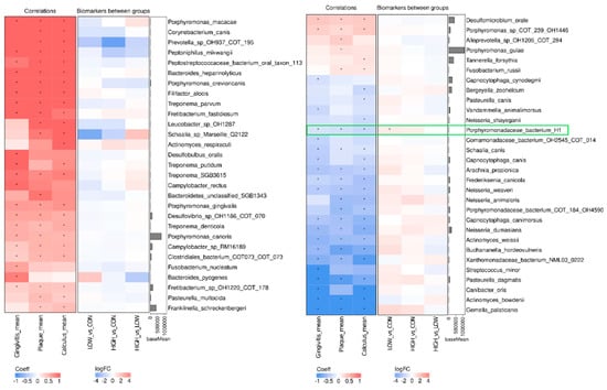 Several species were positively correlated with gingivitis, plaque, and calculus scores, including Porphyromonas macacae, Corynebactum canis, Peptoniphilus mikwangi, Porphyromonas crevoricanis, Filofactor alocis, Treponema parvum, Fretibacterium fastidiosum, and species of Prevotella and Peptostreptococcaceae, indicating a negative association with oral health (Figure 5). The abundance of other species, including Gemella palaticanis, Actinomyces bowdenii, Canibacter oris, P. dagmatis ATCC 51570, and species of Neisseria, were negatively correlated with gingivitis, plaque, and calculus scores, indicating a positive association with oral health. The abundance of Porphyromonadaceae bacterium H1 significantly increased (log2FC = 0.721 ± 0.220, adj. p = 0.037) in the LOW group when compared with the CON group and was inversely correlated with gingivitis, plaque, and calculus scores, indicating a positive association with oral health (Figure 5).