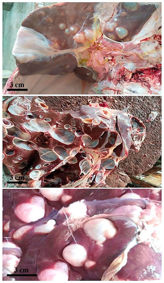 - Usman, M.; Rizwan, H.M.; Sajid, M.S.; Kausar, R.; Tahir, U.B.; Abbas, H.; Ateeq, M.K.; Raza, M.; Maqbool, M.; Fouad, D.; et al. Prevalence and Histopathological Analysis of Cystic Echinococcosis in Ruminants of District Narowal, Pakistan: Focus on Pulmonary Involvement. Rev. Bras. Parasitol. Vet. 2024, 33, e016824. [Google Scholar] [CrossRef] [PubMed]