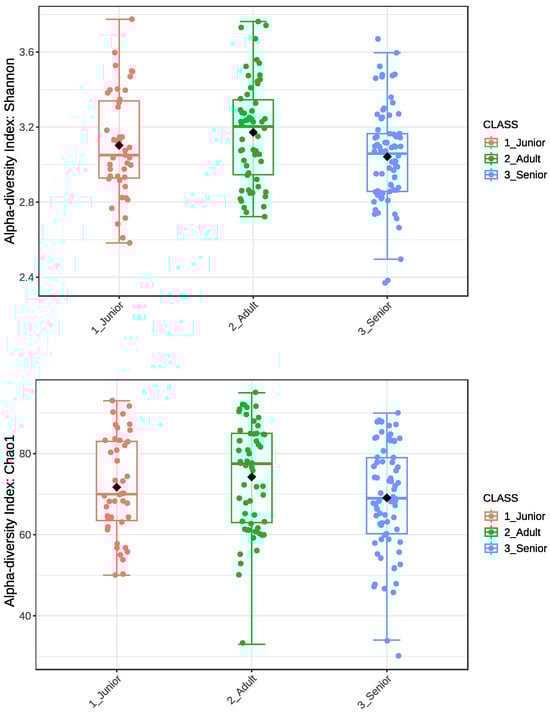 Figure 1 presents the Shannon and Chao1 alpha diversity indices of the gut microbiota in the entire dog population (n = 175), categorized into Junior, Adult, and Senior groups. The boxplot illustrates the distribution of alpha diversity within each age group, highlighting median values, interquartile ranges, and individual data points. Significantly lower values (p < 0.05) were observed for the Shannon index in the Senior group compared to the Adult group.
