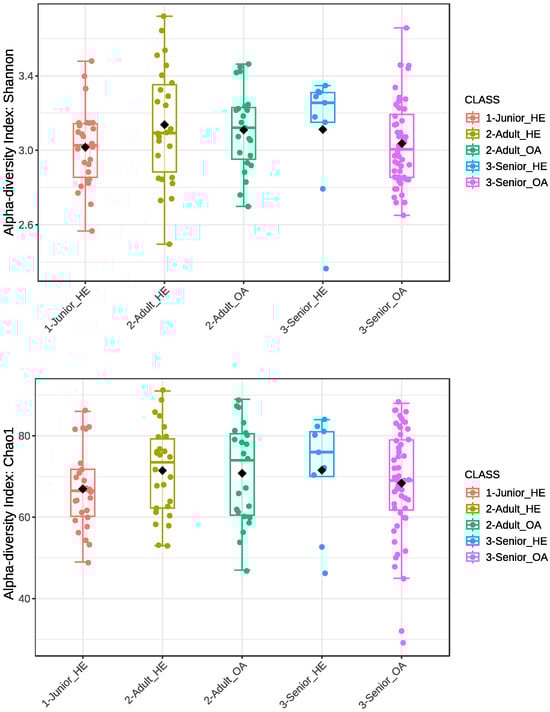 Alpha diversity index of Shannon and Chao1 of gut microbiota of selected healthy and osteoarthritic dogs grouped in Junior, Adult, and Senior based on age. Groups did not significantly differ for p < 0.05. Junior_HE: healthy dog with age ranging 20–46 months; Adult_HE: healthy dog with age ranging 47–92 months; Adult_OA: osteoarthritic dogs with age ranging 47–92 months; Senior_HE: healthy dogs with age ranging 93–168 months; Senior_OA: osteoarthritic dogs with age ranging 93–168 months.
