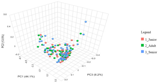 The beta diversity of the gut microbiota across different age groups of dogs was analyzed using the Bray–Curtis dissimilarity index and visualized through a Principal Coordinate Analysis (PCoA) plot (Figure 3). The distribution of data points representing Junior, Adult, and Senior dogs does not indicate distinct clustering among the age groups (p > 0.05). Instead, there is considerable overlap, suggesting that the gut microbiota composition remains relatively similar across different life stages.