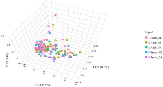 Table 2 presents data on a subset of 136 dogs categorized by age group and health condition (healthy or osteoarthritic). The “other” disease category from Table 1 was not included here, focusing solely on healthy vs. osteoarthritic dogs. The new groups were Junior healthy (Junior_HE; n = 26), Adult healthy (Adult_HE, n = 26), Senior healthy (Senior_HE, n = 9), Adult osteoarthritic (Adult_OA, n = 23) and Senior osteoarthritic (Senior_OA, n = 52).