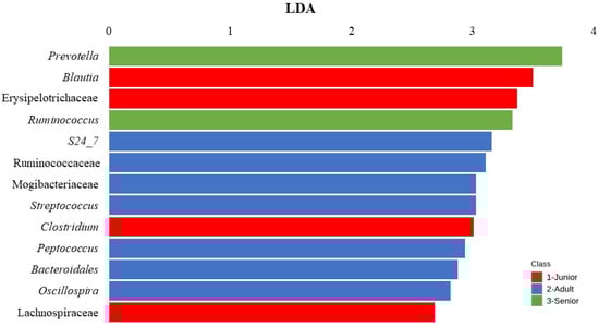 Figure 5 presents a LEfSe analysis identifying bacterial taxa that were significantly different across the three age classes (Junior, Adult, and Senior) and in the Supplementary Table S1 the comparison of abundances between groups is reported. The LDA score (x-axis) quantifies the effect size of each significantly enriched bacterial taxon. The bacterial features (y-axis) represent taxa with an LDA score > 2 and an FDR < 0.10, indicating statistical significance. The results show that different bacterial taxa were associated with specific age groups. In the Adult group, the taxa S24_7, Ruminococcaceae, Mogibacteriaceae, Streptococcus, Peptococcus, Bacteroidales and Oscillospira significantly differed from the other groups.