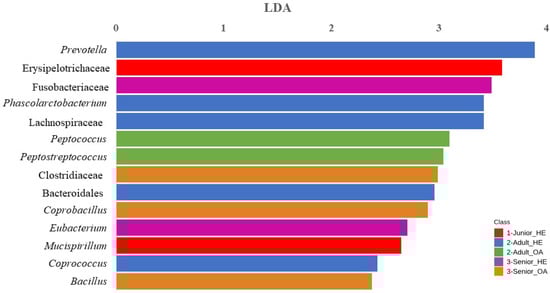 Result of Linear Discriminant Analysis (LDA) Effect Size of taxa which differs (FDR < 0.10; LDA score > 2) between age in healthy and osteoarthritic dog population (n = 136). Junior_HE: healthy dog with age ranging 20–46 months; Adult_HE: healthy dog with age ranging 47–92 months; Adult_OA: osteoarthritic dogs with age ranging 47–92 months; Senior_HE: healthy dogs with age ranging 93–168 months; Senior_OA: osteoarthritic dogs with age ranging 93–168 months.