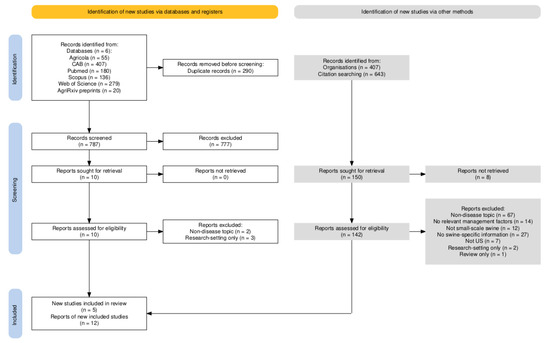 Because work was occurring simultaneously by two reviewers, all citations and papers who cited them were reviewed from the ten full papers that were reviewed, not just the five included in the final scoping review. In total, 643 citations were reviewed after removal of duplicates (n = 162 duplicates removed). After screening the titles, abstracts from 188 sources were reviewed. Sixty sources were selected for review in full. Seven were included in the final scoping review. Reasons for exclusion included the following: n = 13 non-disease topic, n = 7 no relevant management factors reported, n = 12 not small-scale swine, n = 12 no swine-specific information, n = 7 not US, n = 1 research-setting only, and n = 1 review only.