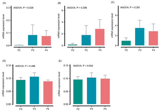 The activities of liver T-AOC (one-way ANOVA, p = 0.026), SOD (one-way ANOVA, p = 0.025), GSH-PX (one-way ANOVA, p = 0.044), and MDA (one-way ANOVA, p = 0.001) were significantly higher in the F4 group compared to the other groups, whereas the liver ALT (one-way ANOVA, p = 0.001) and AST (one-way ANOVA, p = 0.053) activities in the F3 group were higher than those in the other groups (Table 3).