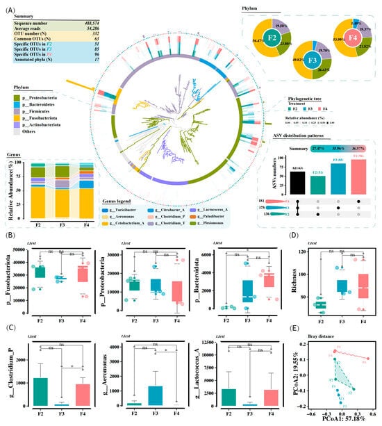 Effects of the feeding frequency on the diversity of the intestinal microbiota of H. wyckioides. (A) Bar charts explain the relative abundances of dominant taxa at amplicon sequence variants (ASVs) and phylum levels. The upset plot shows the number of unique and shared ASVs in each group. Histogram shows the relative abundances of dominant genera. The phylogenetic tree was drawn using ggtree. The inner to outer frontal layout shows the microbial evolutionary branches colored by different phyla, microbial rings colored by different phyla, and relative abundance heatmaps colored by group. (B) Boxplot shows the relative abundance of Bacteroidota. (C) Boxplot shows the relative abundance of Aeromonas. (D) Boxplot of richness. (E) PCoA profile based on Bray–Curtis distance. F2, the fish were fed twice per day at 8:00 and 20:00; F3, the fish were fed three times per day at 8:00, 14:00, and 20:00; F4, the fish were fed four times per day at 9:00, 12:00, 16:00, and 20:00. * p < 0.05.