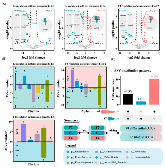 Compared to the F2 group, the intestinal microbiota of H. wyckioides in the F3 group showed 3 upregulated and 14 downregulated ASVs, whereas the F4 group had 25 upregulated and 19 downregulated ASVs (Figure 4A). In the F3 group, the upregulated ASVs were from Bacteroidetes and Proteobacteria, whereas the downregulated ASVs were mainly from Firmicutes and Proteobacteria (Figure 4B). In the F4 group, the upregulated ASVs were mainly from Proteobacteria and Actinobacteriota, whereas the downregulated ASVs were primarily from Proteobacteria (Figure 4B). A total of 48 distinct ASVs were identified from the three pairwise comparisons (Figure 4C).