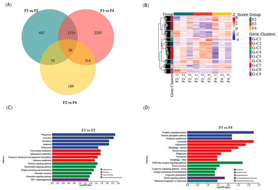 A total of 4518 differentially expressed genes (DEGs) were identified among the different feeding frequency groups. Specifically, there were 1810, 3853, and 597 DEGs between the F3 and F2 groups, the F3 and F4 groups, and the F2 and F4 groups, respectively. Additionally, there were 20 common DEGs among all three groups (|log2FoldChange| > 1 and p < 0.05; Figure 5A). These DEGs showed significant differences among the three groups, as demonstrated by the clustering analysis, which revealed aggregated samples from the three groups (Figure 5B). Further analysis using KEGG enrichment revealed that the F3 group was significantly enriched in cellular processes, metabolism, organismal systems, and environmental information processing pathways compared to the F2 group (Figure 5C). Similarly, the F3 group was also significantly enriched in metabolism, cellular processes, organismal systems, environmental information processing, and genetic information processing pathways compared to the F4 group (Figure 5D).