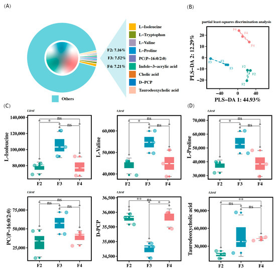 Statistics of differential metabolites in the intestine of juvenile H. wyckioides fed at different frequencies. (A) The main enriched metabolites in the feces of H. wyckioides, along with the proportions of these major metabolites in each feeding frequency group. (B) PLS-DA profile of metabolites identified in positive- and negative-ion modes. (C,D) Significant changes in major metabolites. F2, the fish were fed twice per day at 8:00 and 20:00; F3, the fish were fed three times per day at 8:00, 14:00, and 20:00; F4, the fish were fed four times per day at 9:00, 12:00, 16:00, and 20:00. * p < 0.05; ** p < 0.01.