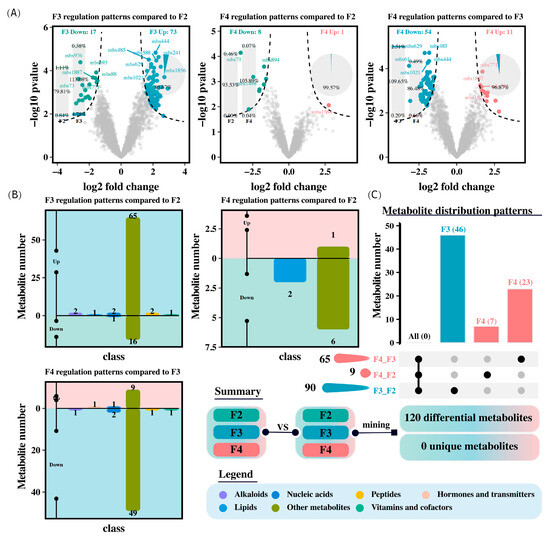 Unannotated and duplicated components were removed to screen for different metabolites (|log2FoldChange| > 1 and p < 0.05; Figure 7). The F3 group showed 90 different metabolites, with 73 upregulated and 17 downregulated, primarily in the categories of alkaloids, lipids, peptides, and vitamins and cofactors, compared to the F2 group. In contrast, the F4 group only had nine different metabolites, with one upregulated and eight downregulated, mainly in the category of lipids (Figure 7). Furthermore, the F4 group had 65 different metabolites compared to the F3 group, with 11 upregulated and 54 downregulated, primarily in the categories of alkaloids, lipids, hormones and transmitters, peptides, and vitamins and cofactors.