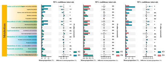 The KEGG metabolic pathways of the differentially abundant metabolites were analyzed by setting a minimum abundance threshold of 0.1% for recognizable tertiary pathways. The results indicated that these metabolites were annotated to 7 KEGG secondary pathways and 17 KEGG tertiary pathways (Figure 8). In comparison to the F2 group, the F3 group showed significant activation of arginine and proline metabolism; arginine biosynthesis; glycine, serine, and threonine metabolism; clavulanic acid biosynthesis; monobactam biosynthesis; nicotinate and nicotinamide metabolism; and pyrimidine metabolism. Meanwhile, the results show significantly inhibited histidine metabolism, glycerophospholipid metabolism, and porphyrin metabolism. In contrast, the F4 group showed significant activation of tryptophan metabolism. The F4 group showed significant inhibition of arginine and proline metabolism, arginine biosynthesis, clavulanic acid biosynthesis, monobactam biosynthesis, arachidonic acid metabolism, nicotinate and nicotinamide metabolism, porphyrin metabolism, and pyrimidine metabolism compared to the F3 group (Figure 8).
