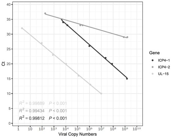 Standard curves were generated using ICP4-1, ICP4-2, and UL15 genes using 10-fold serial dilutions. Efficiencies were 97.62%, 627.89%, and 98.98%, respectively.