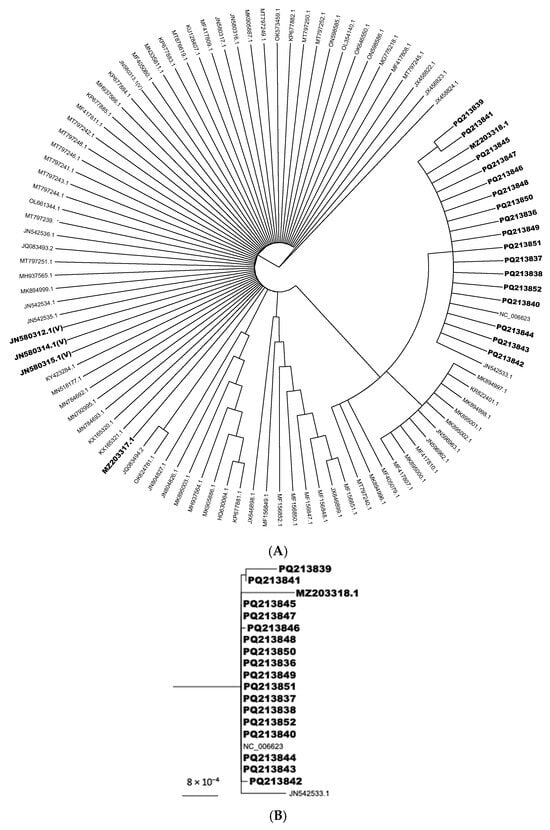 Each sequenced positive sample produced an individual consensus sequence, which was subsequently curated using Geneious Prime software v2023.2.1. A Phred quality score cutoff of 20 was applied. The resulting consensus sequences were then aligned with 64 complete ILTV genomes obtained from the NCBI database (Supplementary Table S1). Alignments were carried out with MAFFT v7.490, applying the following parameters: scoring matrix 200PAM, k = 2; gap open penalty: 1.53; offset value: 0.123 [35]. Phylogenetic trees were constructed using the Geneious tree builder. Eight iterations were performed using the Jukes–Cantor genetic distance model, the neighbor-joining method, and bootstrap resampling with 100 replicates. Under the same parameters, consensus trees were constructed. The R package “ggtree” was used to visualize the phylogenetic branch containing the sequences of interest [36].