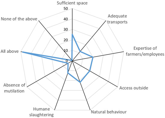 When asked about the most important factors in determining animal welfare (multiple answers were allowed), 25% of respondents selected sufficient space, 21% natural behaviour, 20% expertise of the farmer or employees, 19% access outside, 12% humane slaughter, 11% adequate transport, 5% absence of mutilation, and 48% of respondents believed all the mentioned aspects to be important. Results are shown in Figure 1.