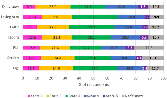 In summary, dairy cows’ welfare received the highest average scores (3, indicating a medium welfare level). Rabbits, laying hens, and cattle had an intermediate score (average score: 2.8 for each of the three species). Broilers and pigs’ welfare levels were more frequently scored as lower, resulting in the most critical perceived welfare level (average score is 2.7 for both species). Lastly, the fish welfare level was unknown by several respondents, while the remaining ones judged it as moderate (average score: 2.8). Overall, the average scores were very similar across species.