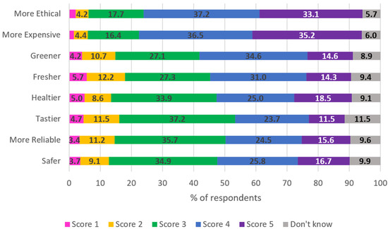 Answers (N = 384) to the question: “In your opinion, products obtained respecting high animal welfare standards are also: (1 = completely disagree; 2 = partially disagree; 3 = neutral; 4 = agree; 5 = completely agree)” The numbers represent the percentage of answers per each score.