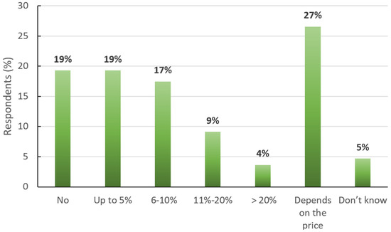 Respondents were then asked if they would be willing to pay more for products sourced from animal-friendly production systems. Nearly half of the respondents (49%) indicated a willingness to pay more for higher-welfare products, with an accepted price increase up to either 5% or 10% in most cases, as shown in Figure 4. However, the remaining half of consumers were either not willing to pay more or declared that they were price-sensitive, answering that their willingness depended on the cost of the product.
