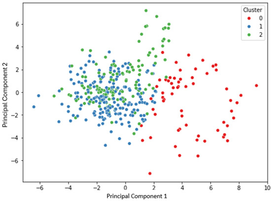 Cluster analysis based on all variables in the dataset identified three distinct clusters, as determined by the elbow method applied to the inertia index. The results of the k-means clustering were projected onto a two-dimensional space using Principal Component Analysis (PCA), as shown in Figure 5.