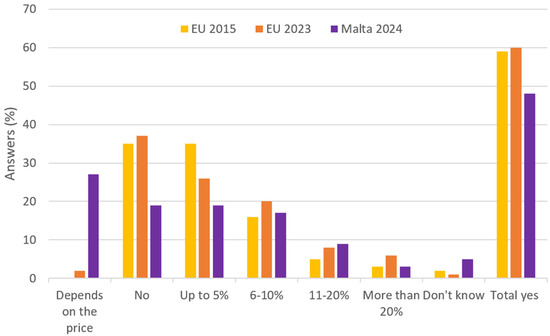 Comparison of the willingness to pay expressed by European consumers in the 2015 Eurobarometer [21], in the 2023 Eurobarometer [22] and in the present study (as reported also in Figure 4).