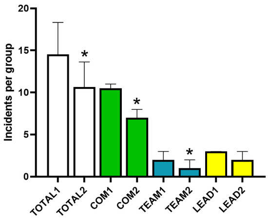 Average total incidents in phase 1 (pre-lecture) and phase 3 (post-lecture) per group of students and average number of incidents for each soft skill evaluated during the activity. Columns represent the mean and the bar is the standard deviation. TOTAL1, total number of incidents per group in pre-lecture simulations; TOTAL2, total number of incidents per group in post-lecture simulations; COM1, client-oriented communication mistakes in pre-lecture simulations; COM2, client-oriented communication mistakes in post-lecture simulations; TEAM1, teamwork mistakes in pre-lecture simulations; TEAM2, team-work mistakes in post-lecture simulations; LEAD1, leadership errors in pre-lecture simulations; LEAD2, leadership errors in post-lecture simulations. * p < 0.05 vs. pre-lecture.