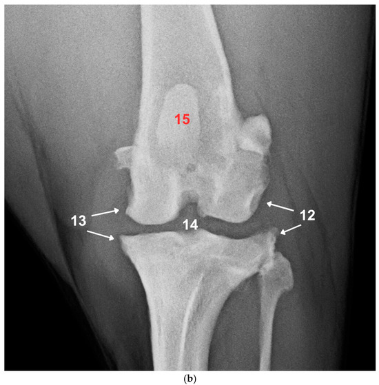 In order to evaluate whether progression of OA took place between surgery and follow-up, a modified version of the OA scoring system published by Wessely et al., in 2017, was used [25]. We modified the scoring system by removing the following three originally described areas to prevent any interference due to callus formation after tibial tuberosity transposition, implants still in situ, and double scoring: the tibial tuberosity (formerly point 6), the cranial aspect of the tibial plateau (point 7), and the patella (point 15) in the craniocaudal view (Figure 1a,b). With the remaining 12 points available for assessment, the OA scores for each individual radiograph ranged from 12 to 48 points.