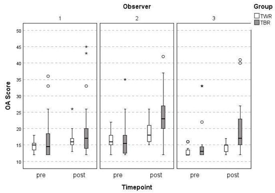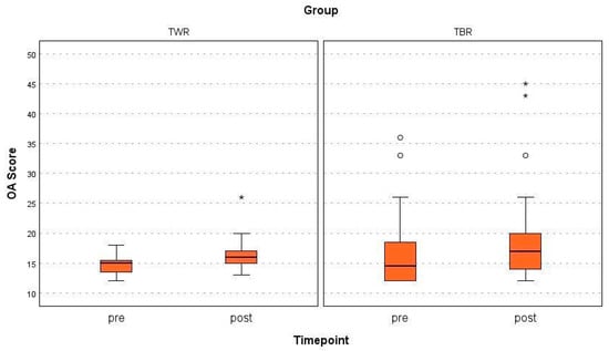 The mean increase in the total OA score of all three observers was 1.9 points in the TWR group and 5.2 in the TBR group, significantly in the TBR group (p < 0.001) but not in the TWR group (p = 0.084).