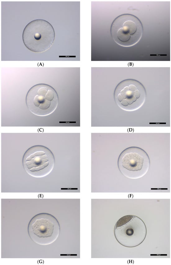 Among the environmental factors, temperature is recognized as particularly influential, directly impacting developmental rates, embryo size, and overall survival [,]. Marine fish embryos and larvae are generally more sensitive to environmental fluctuations than adult fish [], and suboptimal temperatures can delay development or induce malformations, with optimal hatching success typically observed within a narrow thermal range. Similarly, salinity stability is critical for embryo viability, with C. mesoleucus likely requiring near-full-strength seawater (32–34 ppt) for successful hatching and subsequent larval development. Dissolved oxygen levels must be maintained near saturation to avoid dramatically reduced hatching rates. Photoperiod also influences larval physiology, with inappropriate light exposure potentially increasing mortality and abnormalities, while an appropriate light–dark cycle can improve survival and development. Furthermore, maintaining pH within a stable seawater range (~7.9–8.4) is essential to prevent poor hatching success and deformities. Therefore, a comprehensive investigation into the early developmental trajectory of C. mesoleucus and the specific effects of temperature and salinity on its embryonic and larval stages is crucial for establishing effective aquaculture protocols and overcoming the current limitations in captive breeding.