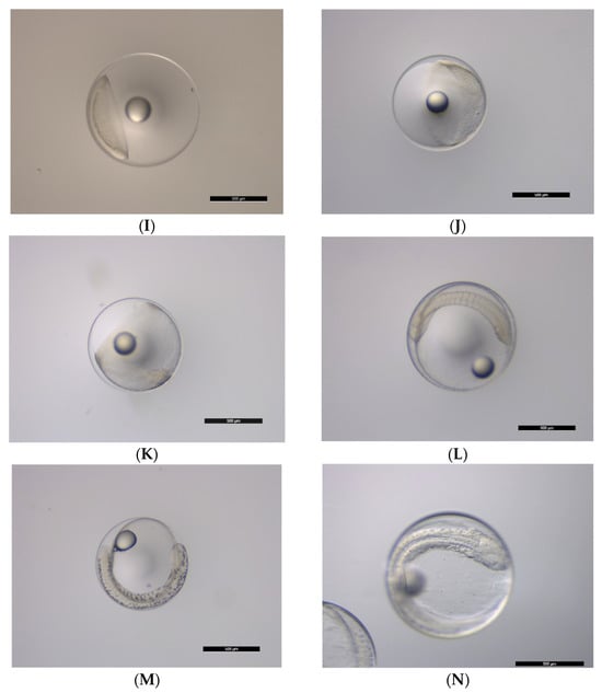 The fertilized eggs of C. mesoleucus are spherical, transparent, and buoyant, containing a single oil globule. The key characteristics of embryonic development are summarized in Table 1. Under controlled conditions of 27 ± 0.5 °C and a salinity of 33.5 ± 0.5 psu, the fertilized eggs diameters ranged from 0.90 to 0.96 mm (0.93 ± 0.02 mm, n = 15), while the oil globule diameter varied between 0.22 and 0.23 mm (0.23 ± 0.01 mm, n = 15) (Figure 1A). The egg reached the 2-cell stage at 40 min post-fertilization (pf), showing the first cleavage (Figure 1B). The 4-, 8-, 16-, 32-, and 64-cell stage were reached at 50 min pf, 1 h 2 min pf, 1 h 14 min pf, 1 h 27 min pf, and 1 h 38 min pf, respectively (Figure 1C–G). The embryo reached the high stage at 1 h 58 min pf, at which time the blastomeres were countless (Figure 1H). At 7 h 10 min pf, the blastodisc covered approximately 30% of the yolk (Figure 1J). By 8 h 3 min pf, the gastrula stage commenced, with the embryo covering 70% of the yolk, and the embryonic shield appearing (Figure 1K). At 8 h 55 min pf, the tail bud appeared, and the blastopore closed, reaching the neurula stage (Figure 1L). At 9 h 38 min pf, the myomeres and optic lens appeared. At 10 h 12 min pf, melanophores appeared on the body surface (Figure 1M). At 15 h 48 min pf, the heart and auditory vesicles appeared. At 21 h and 55 min pf, embryonic movements became more pronounced, and hatching commenced, with larvae emerging head-first from the egg membrane (Figure 1N).