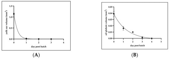 where V represents volume (mm3), and r1, r2, and r3 correspond to the half-length, width, and height of the yolk sac and oil globule, respectively [].