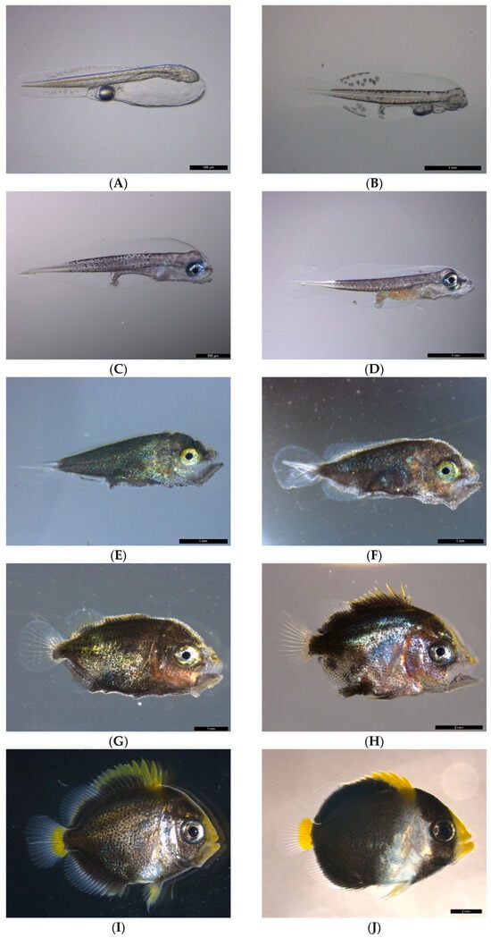 Larval development of C. mesoleucus. (A) Newly hatched yolk-sac larva; (B) 1 dph yolk-sac larva; (C) 2 dph yolk-sac larva; (D) 3 dph larva with functional mouth that begins feeding; (E) 6 dph preflexion larva; (F) 9 dph flexion larva; (G) 12 dph postflexion larva; (H) 19 dph transformed larva; (I) 28 dph juveniles; (J) 32 dph juveniles with full coloration as broodstock is apparent. Scale bar of (A,C) = 500 μm. Scale bar of (B,D–G) = 1 mm. Scale bar of (H,J) = 2 mm.