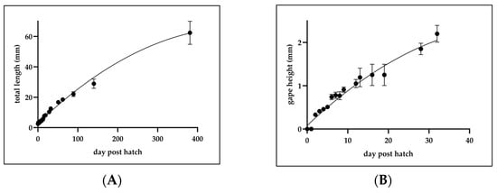 The growth trend of C. mesoleucus larvae shows slow growth initially, but it starts to accelerate significantly after 13 dph. The quadratic growth equation for TL over 381 dph was determined as follows: y = −0.0013x2 + 0.3452x + 2.1334, R2 = 0.9936, where y represents TL (mm) and x represents dph (Figure 4B).