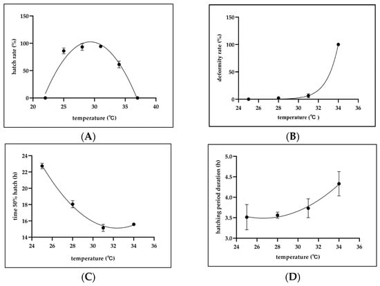 At 25 °C, 28 °C, and 31 °C, the mean hatch rates were 86.0 ± 5.3%, 93.3 ± 6.1%, and 94.0 ± 2.0%, respectively, which were significantly higher than 34 °C (p < 0.05). A notable decline was observed at 34 °C (61.3 ± 6.1%; p < 0.05), while no hatching occurred at either 22 °C and 37 °C, representing a significant reduction compared to the others (p < 0.05) (Figure 5A). The deformity rate of the larvae increased with temperature. At 34 °C, the deformity rate reached 100.0 ± 0.0%, significantly higher than in all other treatments (p < 0.05). At 31 °C, the deformity rate was 27.0 ± 1.4%, which was significantly higher than the 0.0% recorded at 25 °C (p < 0.05). At 28 °C, the rate was 1.6 ± 1.4%, which was not significantly different from the rates observed in the 25 °C and 31 °C groups (p > 0.05) (Figure 5B). The time that elapsed for 50% hatching was negatively correlated with the temperature. At 25 °C, the time to 50% hatch was the longest, recorded at 22.7 ± 0.3 h pf, which was significantly higher than other treatments (p < 0.05). At 28 °C, the time to 50% hatch was longest, recorded at 18.01 ± 0.5 h, which was significantly than other treatments (p < 0.05). At 31 °C and 34 °C, the 50% hatching times were 15.15 ± 0.4 h, and 15.6 ± 0.2 h pf, respectively; these values were not significantly different from each other (p > 0.05), but both differed significantly from those at other temperatures. (p < 0.05). No hatch was observed at 22 °C and 37 °C. (Figure 5C). The hatching period duration increased with the temperature. The mean hatching duration at 34 °C was 4.3 ± 0.3 h pf, which was significantly longer than those at 25 °C (3.5 ± 0.3 h) and 28 °C (3.6 ± 0.1 h) (p < 0.05). The duration at 31 °C (3.7 ± 0.2 h) was not significantly different from the other groups (p > 0.05) (Figure 5D).