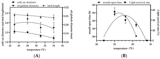 Effects of temperature on (A) 0 dph TL (mm), yolk-sac diameter (mm), globule diameter (mm) (n = 10), (B) mouth open time (n = 10), and 3 dph survival rate (%) (n = 50) of C. mesoleucus larvae.
