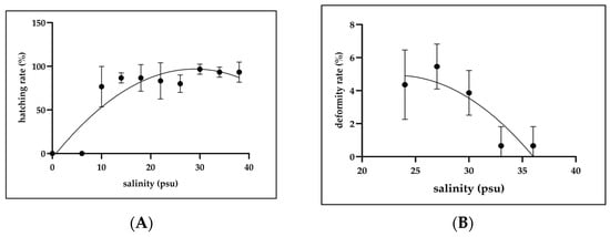 Effect of salinity on (A) hatch rate (%) (n = 10) and (B) deformity rate (%) (n = 50). All treatments were performed in triplicate. Data are expressed as means ± SD.