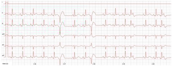 A 5 min 6-lead ECG (EKG 2000, Eickemeyer Medizintechnik, Tuttlingen, Germany) was recorded in right lateral recumbency without sedation. The underlying rhythm was determined, and the presence, number, and coupling interval of ventricular (VPCs) and atrial premature contractions (APCs) were documented. Additionally, signs of complexity (couplets and triplets) and malignancy (R-on-T phenomenon and ventricular tachycardia (VT)) or the presence of conduction abnormalities like atrioventricular blocks or bundle branch blocks were recorded.
