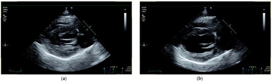 Cat 39 also presented with systolic dysfunction based on increased LVIDs above breed-specific reference intervals [47] and reduced LV GLS (−16.22%) (Table 4). The left and right ventricle were affected, and the cat showed biatrial enlargement. The cat also showed mild pericardial effusion, which was thought to be secondary to FIP and not a sign of congestion in this cat. The cat was started on pimobendan (0.24 mg/kg, q12h, PO) and clopidogrel (18.75 mg/cat, q24h, PO). Diuretics were not considered necessary (Table 2). The echocardiographic data of all four cats can be seen in Table 3 and Table 4.