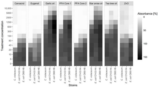 In the present study, the influence of ZnO, two phytogenic prototype essential oil cores (PFA Core 1 and PFA Core 2), and their respective main compounds garlic oil and tea tree oil, as well as carvacrol, eugenol, and star anise oil, was initially investigated on bacterial susceptibility, biofilm formation of E. coli strains O88:H8 and O143:H4, and violacein production of C. violaceum. Treatment with each substance exerted a similar effect on the growth of all bacterial strains (Table 2). In particular, carvacrol and eugenol showed very strong bactericidal effects (MIC of 150–600 ppm), whereas tea tree oil exhibited substantial lower antimicrobial activities against all three E. coli strains (MIC of 2560–10,000 ppm) and C. violaceum (MIC of 2500 ppm). Similarly, garlic oil and star anise oil only inhibited the growth of C. violaceum at 10,000 and 5000 ppm, respectively, while the growth of both tested E. coli strains was not inhibited. Zinc oxide did not inhibit the growth of the E. coli and C. violaceum strains up to the highest tested concentration of 10,000 ppm. The MIC values of substance combinations PFA Core 1 and PFA Core 2 were similar to those of the respective individual substances.