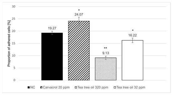 The third model applied in this study evaluated the impact of tea tree oil and carvacrol on the ability of an F4-fimbriated E. coli strain to adhere to the small intestinal mucus of piglets. This is especially relevant in the livestock industry, as F4-fimbriated E. coli are one of the major pathogens associated with PWD, and the production of F4 fimbriae is regulated by quorum sensing [14]. Previous studies demonstrated the potential of cranberry extract to inhibit the adherence of F4- and F18-fimbriated E. coli to intestinal villi in vitro and intestinal epithelium in vivo [38]. A subsequent challenge experiment revealed that cranberry supplementation of feed and drinking water reduced diarrhea as well as the extent and duration of F18-fimbriated E. coli excretion [38]. Thus, it was speculated that tea tree oil, which reduced the adhesion of F4-fimbriated E. coli in the present study, might also increase the resilience of piglets against PWD when supplemented in feed. Treatment with carvacrol, on the other hand, resulted in a higher number of adherent cells, which may indicate increased expression of adhesion factors. However, it is more likely that the chemical stress induced by carvacrol led to the occurrence of autoaggregation events. This type of bacterial behavior serves to protect the involved bacteria from external stresses [39]. However, further studies are necessary to determine the exact nature and cause of this observation.