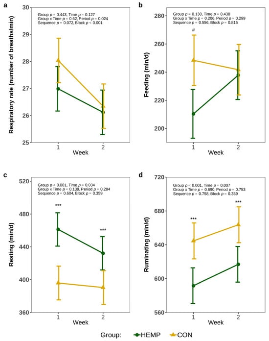 Respiratory rate (a), feeding (b), resting (c), and rumination (d) times per day of cows fed a diet containing 7.4% hemp leaves (HEMP, n = 12) or 3.5% soya extraction meal (CON, n = 12) in the first 2 weeks of the feeding period. # p < 0.1, *** p < 0.001.