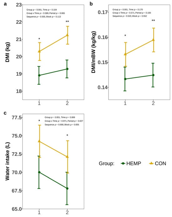 Dry matter intake (DMI) (a), dry matter intake per metabolic body weight (DMI/mBW) (b), and water intake (c) of cows fed a diet containing 7.4% hemp leaves (HEMP, n = 12) or 3.5% soya extraction meal (CON, n = 12) in the first 2 weeks of the feeding period. * p < 0.05, ** p < 0.01.