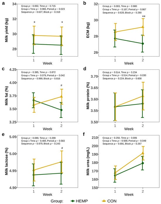 One week before the start of the experiment, milk yield did not differ between the groups (HEMP: 30.2 ± 1.68 kg, CON: 30.8 ± 1.68 kg, p > 0.8). Feeding cows a diet containing Santhica 27 hemp leaves reduced milk yield by 1.1 L/d in week 1, and 1.2 L/d in week 2, compared to a diet containing soya extraction meal (p < 0.05, Figure 3a). However, there was no difference in ECM between the two groups in week 1, but in week 2, ECM was 2 L/d lower in the HEMP compared to CON group (p = 0.002, Figure 3b). The analysis of milk protein and milk urea concentrations revealed no differences between groups (p > 0.1, Figure 3d,f). Furthermore, milk fat and milk lactose concentrations were comparable between the groups in week 1 (p > 0.1), but tended to be lower in HEMP group in week 2 (p < 0.1, Figure 3c,e).
