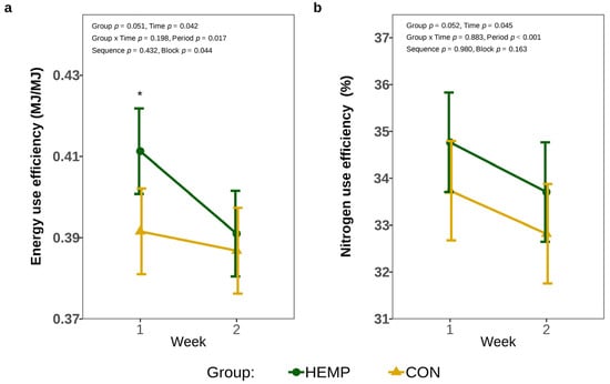 The inclusion of Santhica 27 leaves in the diet increased EUE by 4.8% in week 1 (p = 0.024); however, EUE was no longer affected by the diet after two weeks of hemp feeding (p = 0.618, Figure 4a). In addition, feeding the HEMP diet tended to affect NUE by approx. 1% (p = 0.052), but NUE decreased over time in both the CON and HEMP groups (p = 0.045; Figure 4b).