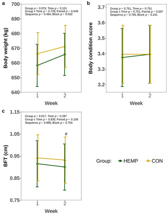 In addition, the BW did not change over time (p > 0.1) and was comparable between groups (p > 0.1, Figure 5a). Comparably, BCS did not differ between the groups or weeks of feeding (p > 0.1, Figure 5b). However, HEMP cows tended to develop a lower BFT compared to CON cows in week 2 (p = 0.061), while BFT was comparable between feeding groups in week 1 Figure 5c).