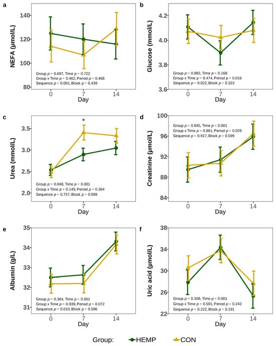 Plasma non-esterified fatty acids (a), glucose (b), urea (c), creatinine (d), albumin (e), and uric acid (f) concentration of cows fed a diet containing 7.4% hemp leaves (HEMP, n = 12) or 3.5% soya extraction meal (CON, n = 12) on day 0, 7 and 14. For statistical analysis of the NEFA concentration, a log-gamma generalized mixed model was used and the data were back-transformed for interpretation. The urea concentration was transformed using log for statistical analysis and back- transformed for interpretation. * p < 0.05.