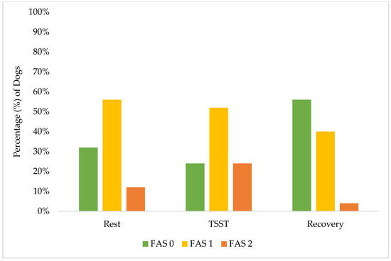 Only 40% of dogs showed increased FAS scores from rest to the TSST, with 52% decreasing from the TSST to recovery, (Figure 3). While this could be explained by a multitude of factors, it is interesting to note that these numbers strongly mirror the findings in Hernander, 2008 [23], which showed dogs’ fear scores collected as they entered a veterinary clinic decreased after being given the ability to rest and settle for 10 to 20 min in the waiting room. However, the fear scores increased again when moving from the waiting room onto a scale to collect weight (the scale was located at the entrance of a long and narrow hallway, which led into the exam room, where a veterinary exam would commence). These correlations suggests that in our secondary analysis of participant dog FAS scores throughout the primary experiment, the WCE—decreased fear scores when allowed time to rest and settle in a novel environment, followed by increased stress scores upon entering a new room that might predict medical handling (a room of panelists wearing white lab coats)—should be heavily considered as a possible cause for the increased percentage of dogs who had an increased FAS score from rest to the TSST.