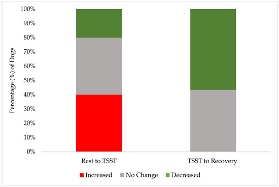 The stacked distribution of FAS score changes between phases: the percentage of dogs whose FAS score increased, decreased, or had no change from the end of the rest phase to during the TSST (“Rest to TSST”); the percentage of individuals whose FAS score increased, decreased, or had no change from the TSST to the end of the recovery phase (“TSST to Recovery”).
