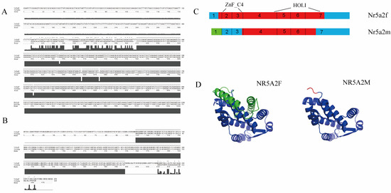 Nr5a2 spliceosome sequence and structure model diagram. (A) Nucleotide sequence analysis; (B) amino sequence analysis of Nr5a2f and Nr5a2m; (C) Nr5a2f and Nr5a2m structure. Blue color indicates untranslated region in cDNA. Red color indicates exon. Blue color indicates non-translated region. The green color indicates 5′ end untranslated region in Nr5a2m, which was different from Nr5a2f; (D) tertiary structure diagrams of Nr5a2f and Nr5a2m proteins. * indicated same amino acid.