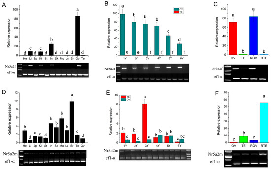 Expression of Nr5a2f and Nr5a2m in different stages of developmental and sex reversal gonads. (A) Expression analysis of Nr5a2f in various tissues; (B) expression analysis of Nr5a2f in developing gonads; (C) expression analysis of Nr5a2f in sex reversal gonads of A. davidianus; (D) expression analysis of Nr5a2m in various tissues; (E) expression analysis of Nr5a2m in developing gonads; (F) expression analysis of Nr5a2m in sex reversal gonads of A. davidianus. ANOVA followed by Duncan’s multiple comparison tests. Different letters differed with statistical significance (p < 0.05). He, heart; Li, liver; Sp, spleen; Ki, kidney; St, stomach; In, intestine; Sk, skin; Mu, muscle; Lu, lung; Br, brain; Ov, ovary; Te, testis; ROV, sex reversal ovary; RTE, ex reversal testis.